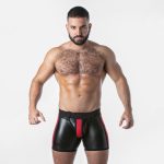 Calções boxer de corte quadrado em pele sintética perfurada com detalhes contrastantes.
