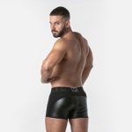 Calções boxer de corte quadrado em pele sintética perfurada com pormenores em contraste.