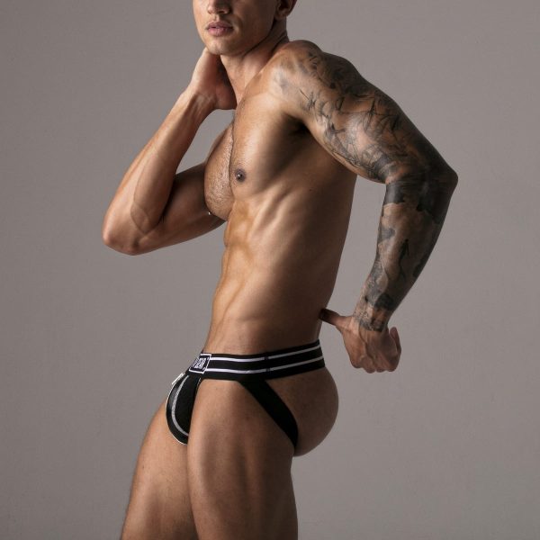 Jockstrap de corte quadrado feito de malha desportiva respirável.